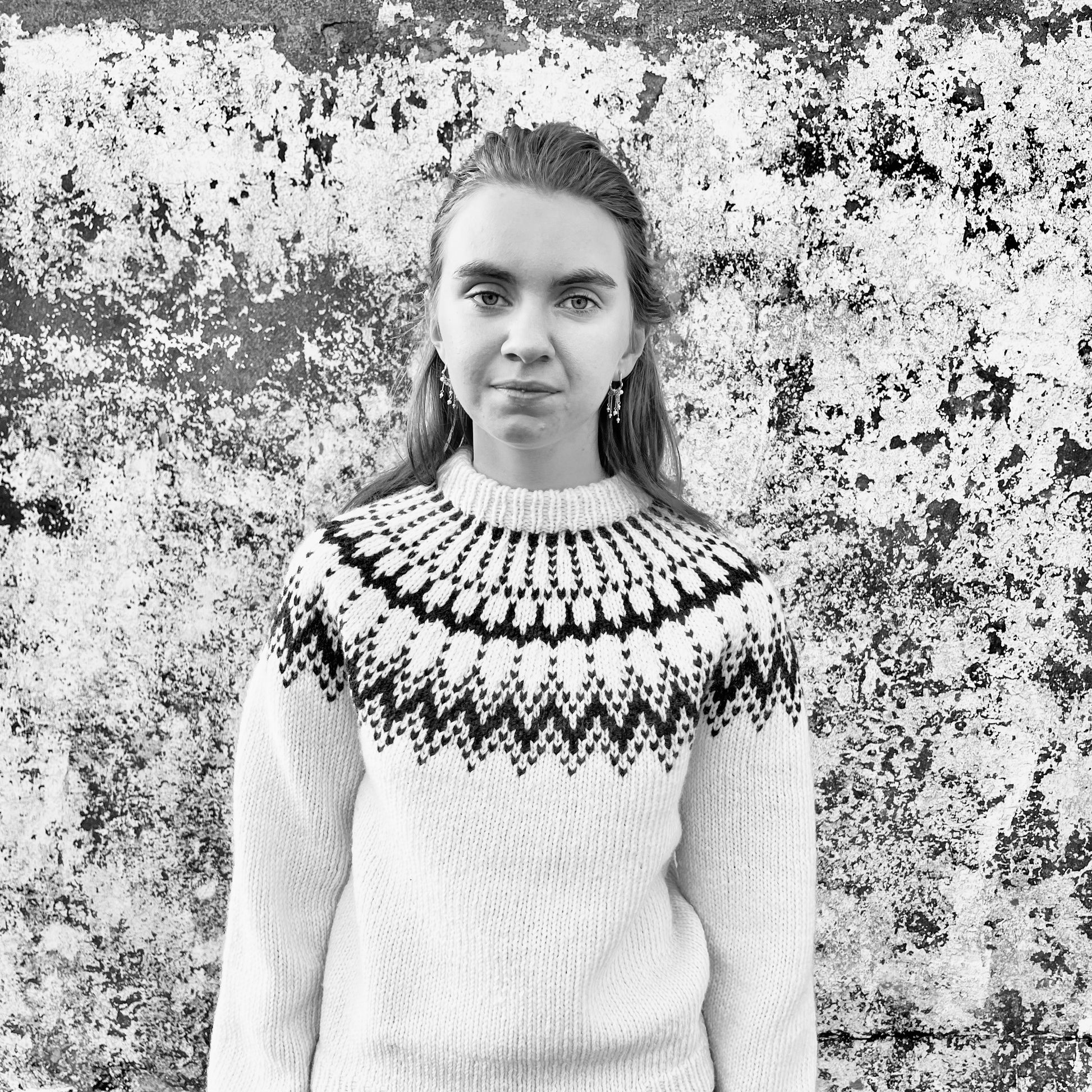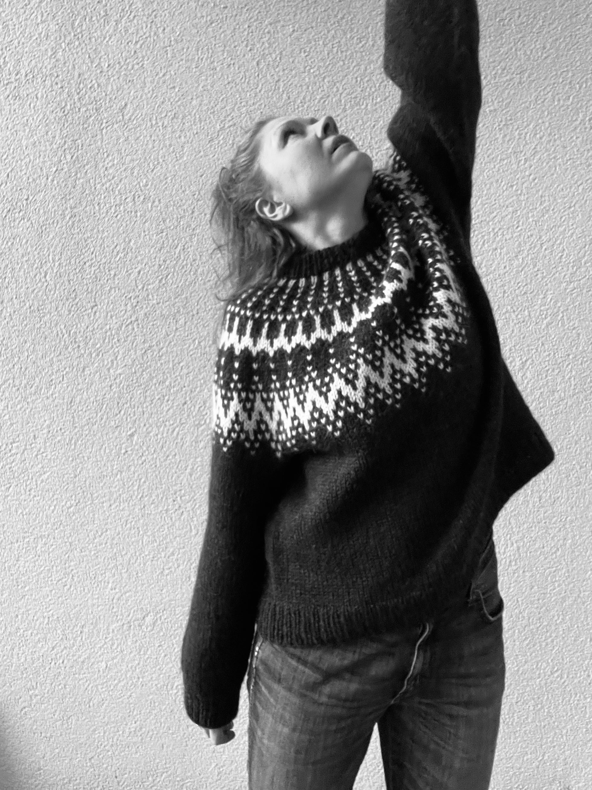 Módelið í dökku peysunni hefur 96 cm í yfirvídd og klæðist st. 4 sem gefur henni 20 cm í hreyfivídd. Módelið í ljósu peysunni hefur 85 cm í yfirvídd og klæðist st. 1 sem gefur henni 9 cm í hreyfivídd. Athugið að hreyfivídd er persónubundin, sumir vilja enga hreyfivídd á meðan aðrir vilja mjög mikla og allt þar á milli. Ef þið eruð efins hvar þið standið varðandi hreyfivídd er mælt með því að þið mælið ykkar yfirvídd og mælið svo peysu sem þið eigið sem er í þeirri stærð sem þið viljið að þessi endi í. Mismunurinn þar á milli er hreyfivíddin sem þið óskið eftir ;)